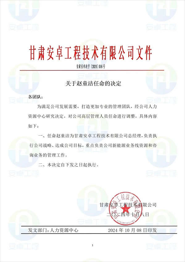 近日,甘肅安卓工程技術(shù)有限公司發(fā)布重大人事任命,任命趙童潔為甘肅安卓工程技術(shù)有限公司總經(jīng)理,負責執(zhí)行公司戰(zhàn)略、達成公司目標,重點負責公司新能源業(yè)務(wù)線資源和咨詢業(yè)務(wù)的管理工作。