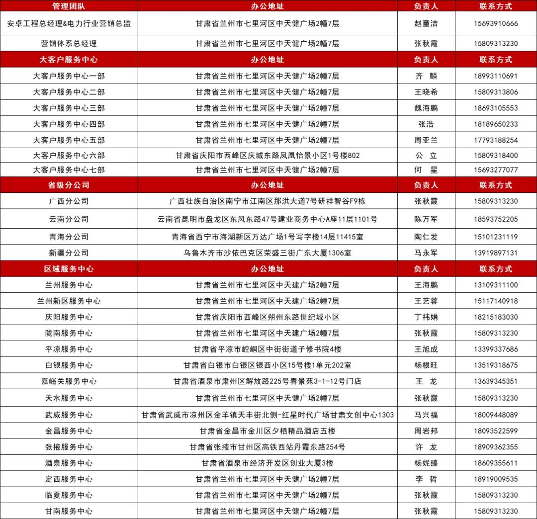 以下為我公司各服務(wù)中心地址及負(fù)責(zé)人聯(lián)系方式,歡迎各位客戶致電聯(lián)系!
